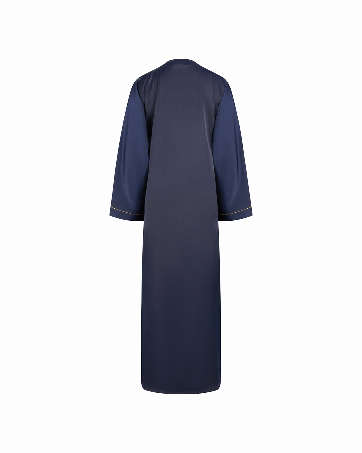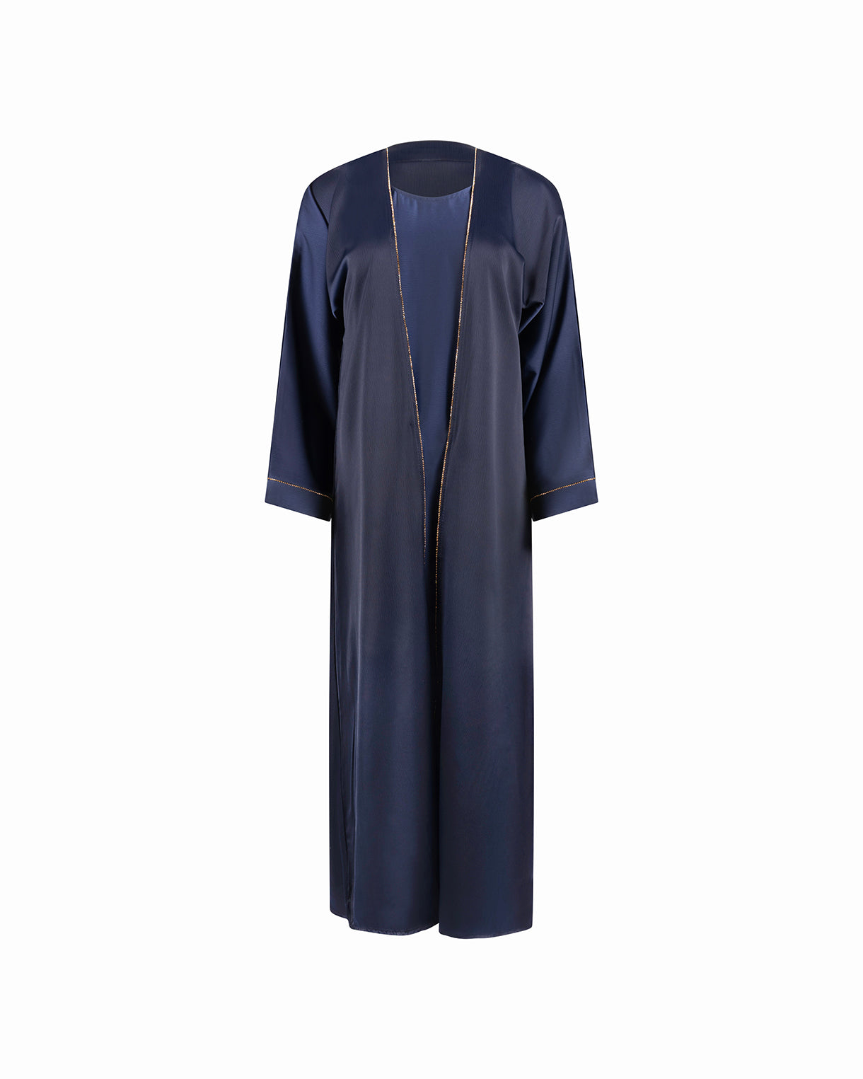 This is a refined two-layer abaya designed for effortless elegance. This style features an attached inner dress that creates a smooth, flowing base, while the outer layer drapes beautifully over it for added depth and movement. The subtle front trim adds a delicate finishing touch, enhancing the overall minimalist aesthetic. With its relaxed silhouette and soft fabric, this abaya offers both comfort and sophistication, making it ideal for everyday wear as well as special occasions.