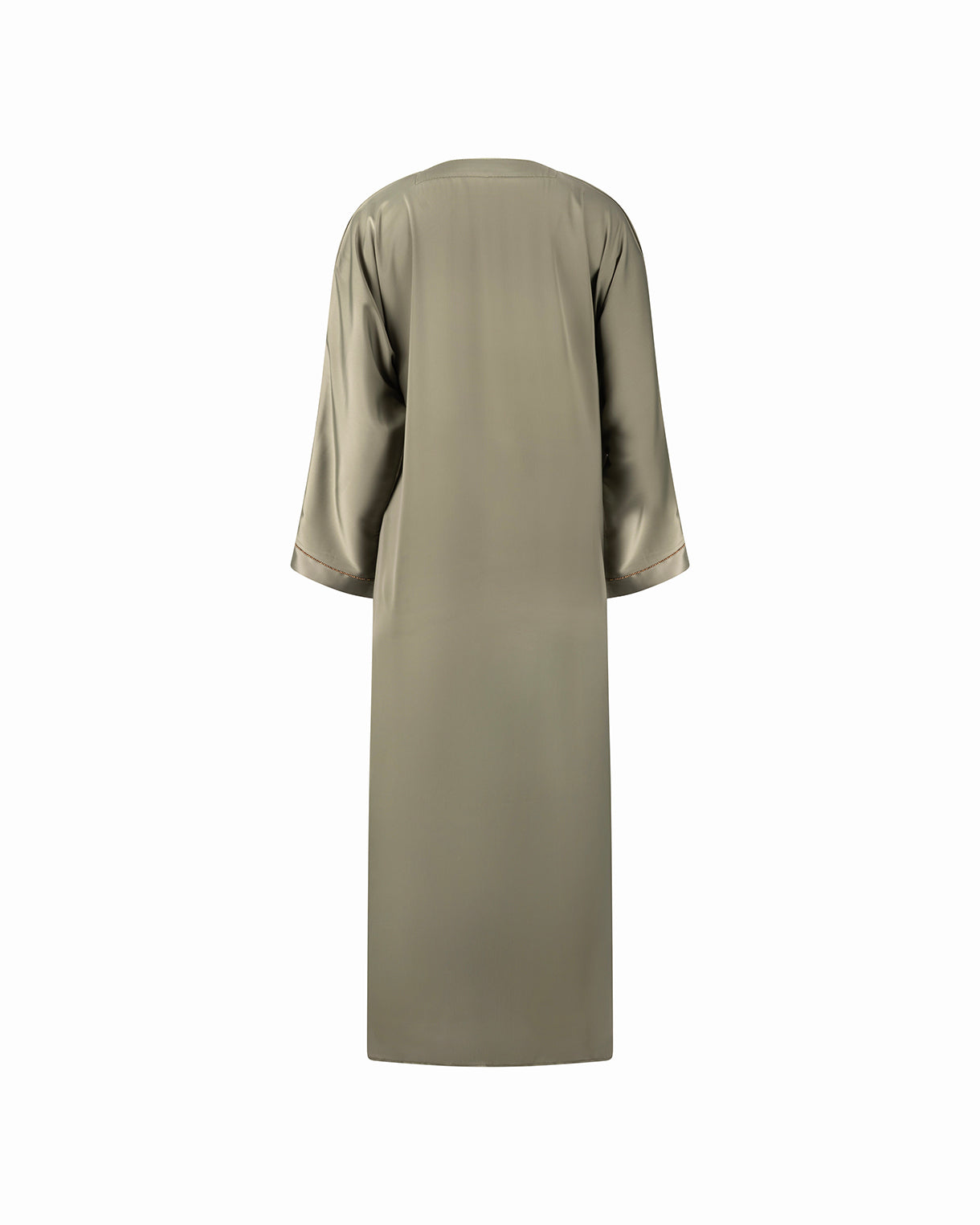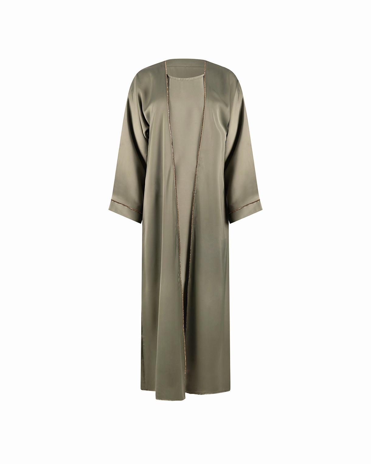 This is a refined two-layer abaya designed for effortless elegance. This style features an attached inner dress that creates a smooth, flowing base, while the outer layer drapes beautifully over it for added depth and movement. The subtle front trim adds a delicate finishing touch, enhancing the overall minimalist aesthetic. With its relaxed silhouette and soft fabric, this abaya offers both comfort and sophistication, making it ideal for everyday wear as well as special occasions.